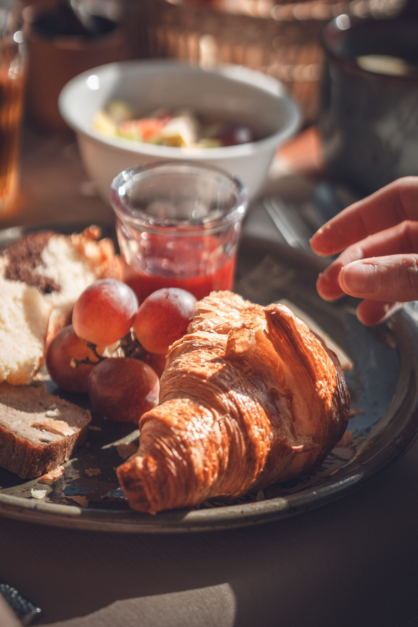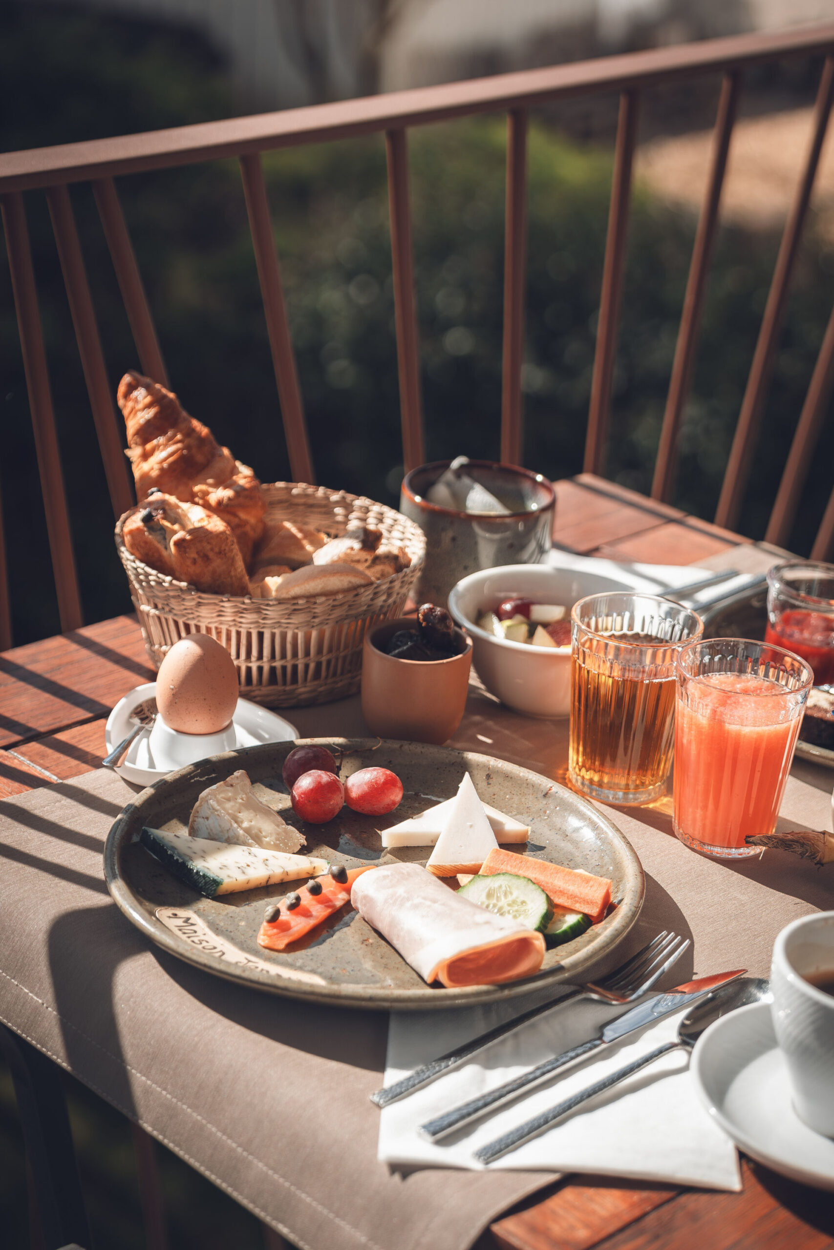 Saumon fumé, œufs brouillés & bacon, pancakes ou gaufres, croque-monsieur jambon-fromage, plateaux de charcuteries & fromages, muesli, céréales, pains et viennoiseries, miels, confitures maison, pâte à tartiner de la région, salade de fruits maison, fromage blanc… mais aussi : jus frais, eaux et boissons chaudes…